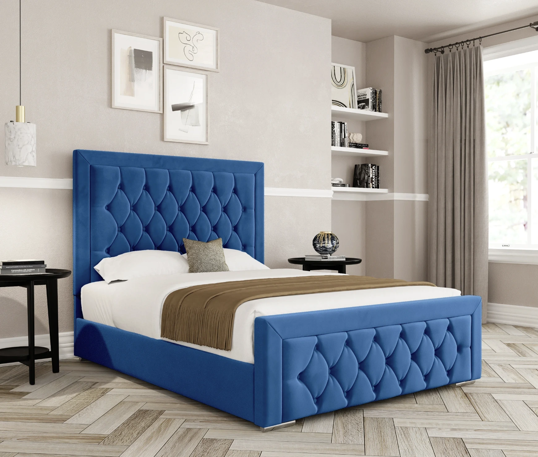 - Features: Deep buttoned design, ample under-bed storage, stylish scroll detailing.