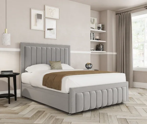 Experience the perfect combination of style and practicality with the Cayton Ottoman Divan Bed with Footboard. This beautifully designed bed features a striking vertically panelled headboard adorned with chrome stud detailing, paired with a matching footboard for a complete, polished finish. Upholstered in premium fabric, the Cayton offers a luxurious feel while the lift-up ottoman base provides ample hidden storage – ideal for bedding, linens, or seasonal items. Designed to elevate your space and simplify your storage needs, the Cayton is the ideal choice for those who want a statement bed without compromising on functionality.