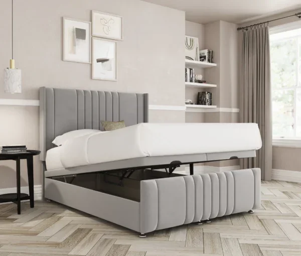 Introducing the Harewood with Wings – a stunning ottoman bed that effortlessly combines elegance and practicality. With its vertical paneling, bold winged headboard, and sleek footboard design, this bed brings a refined edge to any bedroom, all while offering generous hidden storage beneath. Please note, a footboard will add around 2″ (5cm) to the length of the bed.